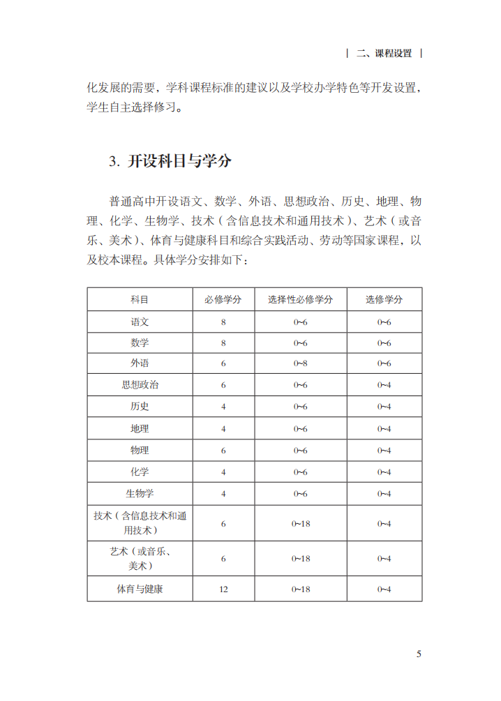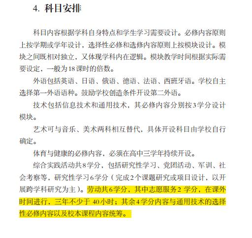 最新方案中,后面的科目设置与学分也有变化,方案要求,普通高中开设语文、数学、外语、思想政治、历史、地理、物理、化学、生物学、技术(含信息技术和通用技术)、艺术(或音乐、美术)、体育与健康科目和综合实践活动等国家课程以及校本课程之外,还应开设劳动课程,劳动共6学分,其中志愿服务2学分,在课外时间进行,三年不少于40小时;其余4学分内容与通用技术的选择性必修内容以及校本课程内容统筹。